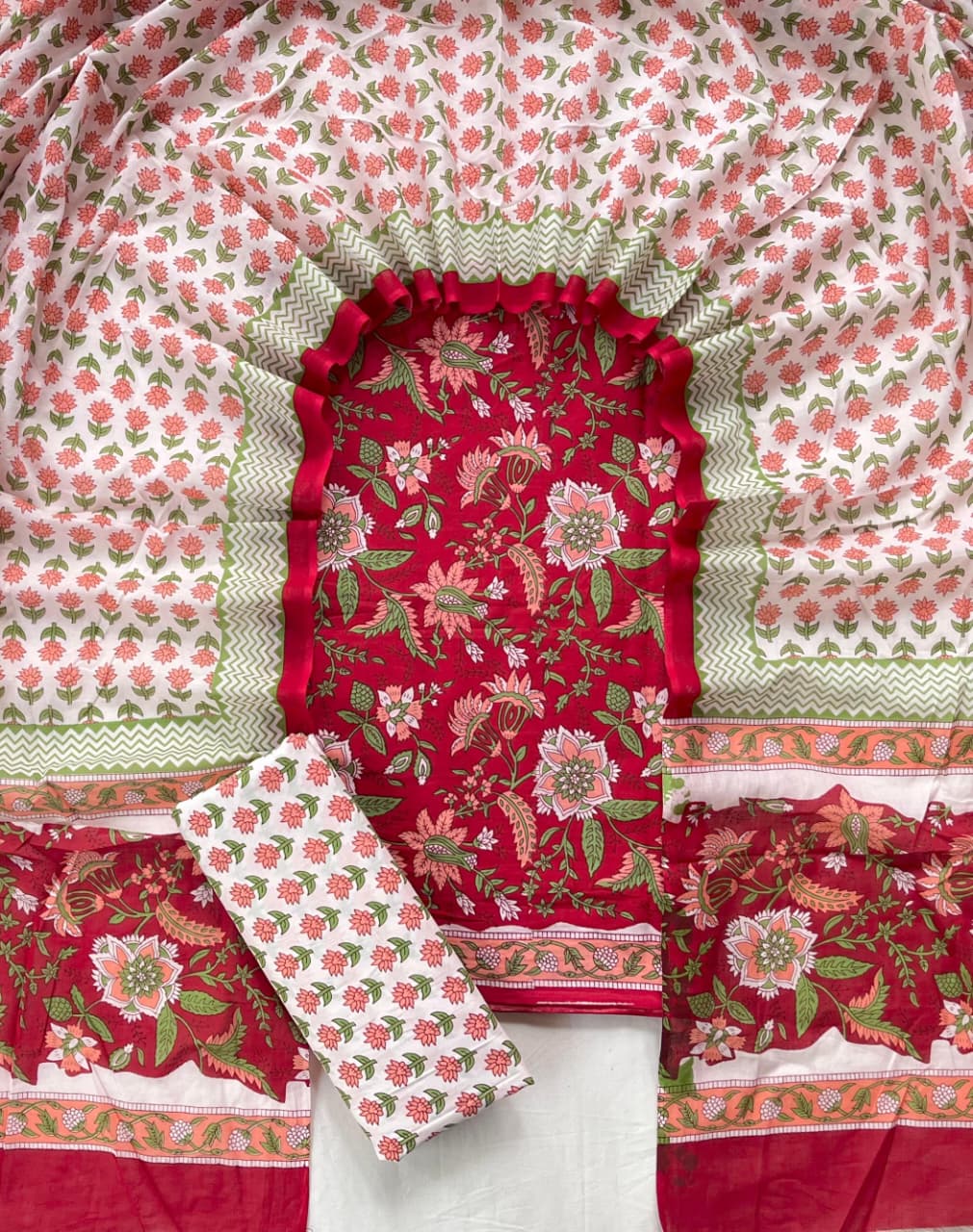 Indulge in the timeless art of hand block printing with this exquisite Pink Floral Cotton Salwar Suit Set from Blockart. Made from premium cotton fabric, this set features intricate floral prints in shades of pink, green, and white. The top boasts a detailed floral design with a charming border, while the dupatta complements the ensemble perfectly. Embrace comfort and style with this artisanal creation.