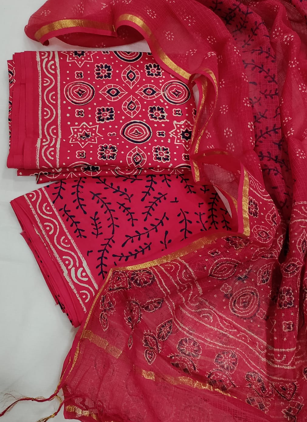 Elevate your ethnic wardrobe with this exquisite hand block printed cotton salwar kameez dress material set from Blockart. The intricate traditional designs in black and white on a vibrant red background showcase the craftsmanship and artistry of Indian textiles. Made from high-quality cotton fabric, this set offers both style and comfort. The Kota Doria dupatta adds a touch of elegance with its semi-transparent texture and golden border. Create your own unique ethnic outfit with this premium dress material set.