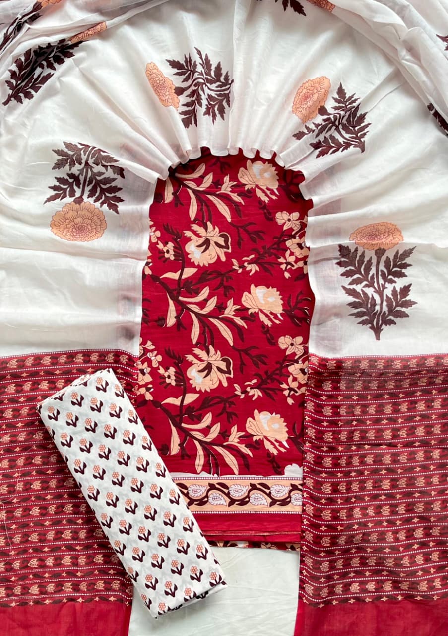 Elevate your ethnic wardrobe with our exquisite Handcrafted Red Floral Cotton Suit Set. This premium ensemble features intricate hand block printing on soft cotton fabric, ensuring comfort and style. The set includes a vibrant red top with rich floral designs, complemented by a white cotton Duptta adorned with leafy and floral motifs. Embrace traditional craftsmanship and elegance with this artisanal creation.