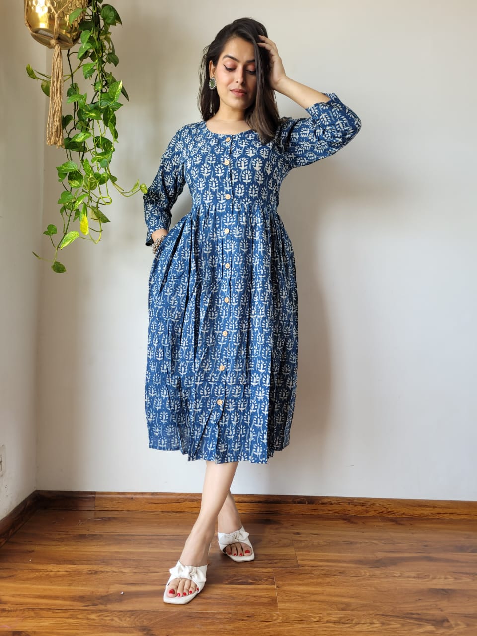 Experience the artistry of hand block printing with our Indigo Bagru Block Printed Long Sleeve Cotton Midi Dress. Crafted from premium Cotton 60*60 Super Dying fabric, this dress features a round neckline, button-down front, gathered waistline, and long sleeves. The skirt boasts a fuller, pleated look and convenient side pockets. Embrace comfort and style in everyday wear with a touch of ethnic charm.
