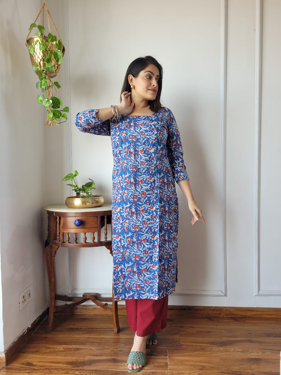 Step into a world of elegance with our Indigo Bliss Floral Hand Block Printed Cotton Kurti Set with Maroon Pants. The kurti, with its square neckline and three-quarter sleeves, showcases a captivating floral pattern in white and red on a soothing blue base. The lightweight cotton fabric offers a gentle touch against your skin, providing a comfortable and breathable wear.