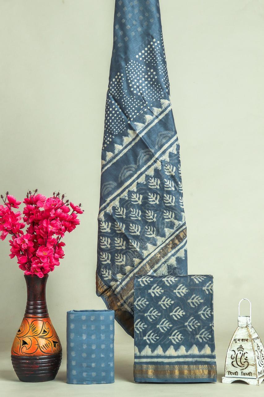 Indigo Blossom Cotton Maheshwari Silk Ensemble