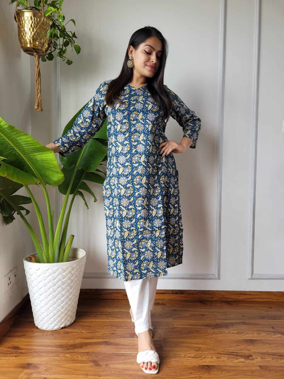 Elevate your wardrobe with the Indigo Floral Bliss Cotton Block Print Kurti Set, a true embodiment of Indian textile artistry and modern sophistication.