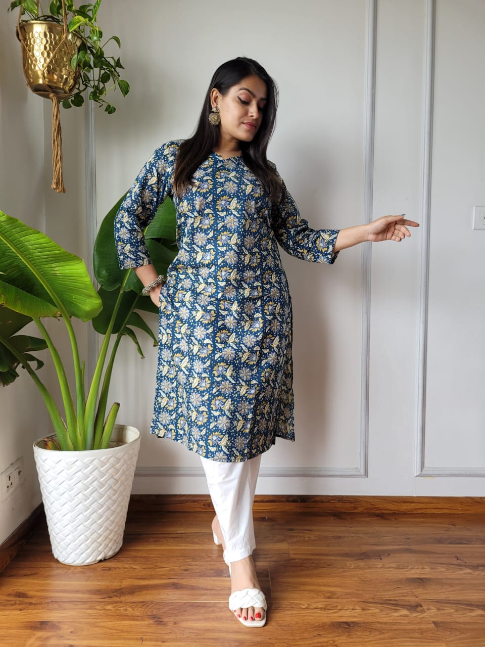 Step into elegance with our Indigo Floral Bliss Cotton Block Print Kurti Set, a masterpiece of traditional Indian craftsmanship. This knee-length kurti features a dark blue base adorned with a charming floral pattern in shades of yellow, cream, and light blue, exuding a blend of heritage charm and contemporary flair.
