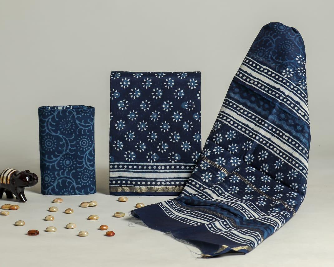 Indulge in the artistry of hand block printing with this exquisite dress set from Blockart. Crafted from premium chanderi silk and cotton, this set features intricate floral motifs in deep indigo hues. The chanderi silk top and duptta add a touch of elegance, while the cotton bottom ensures comfort all day long. Elevate your ethnic wardrobe with this artisanal masterpiece.