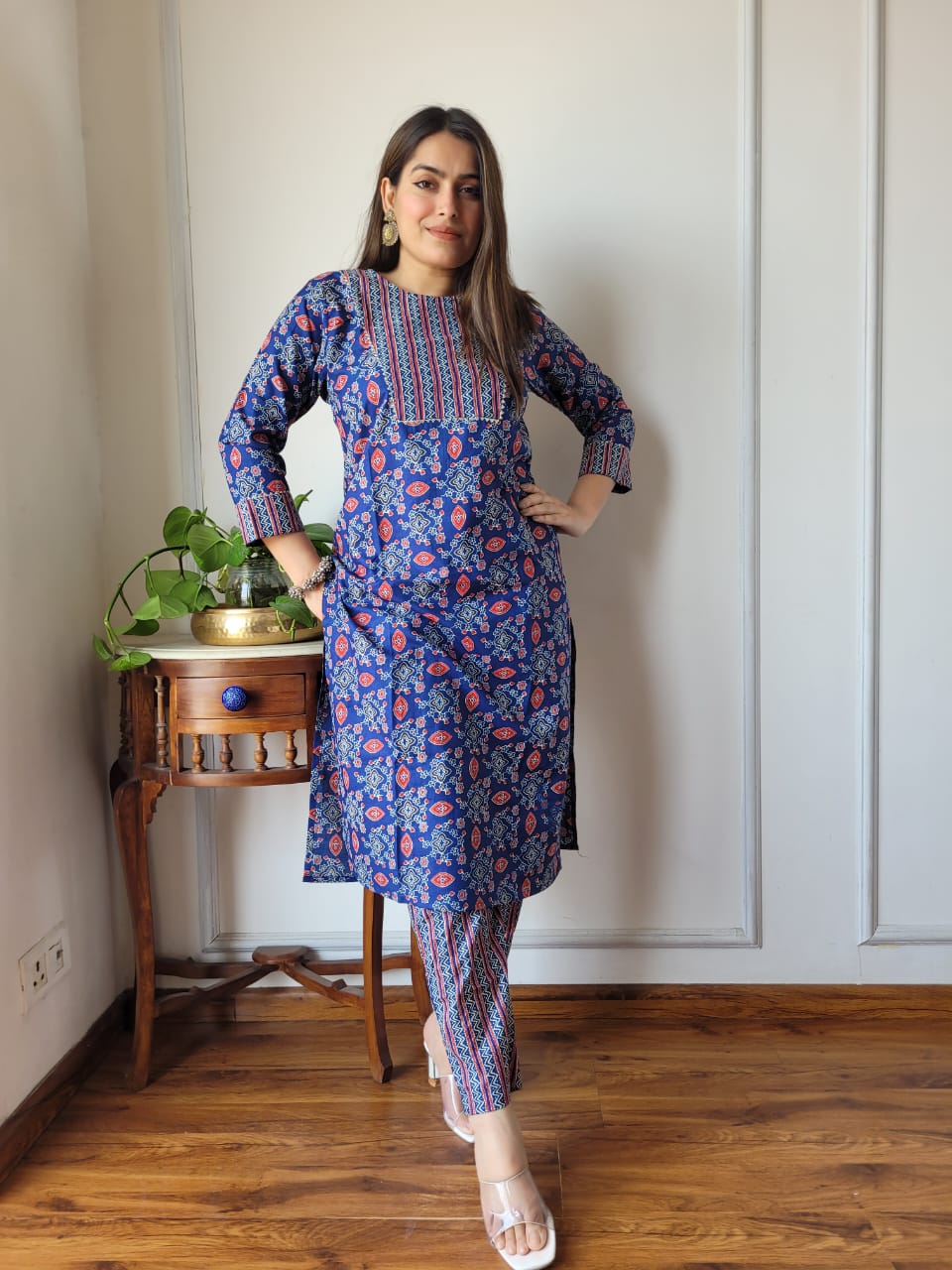 Infuse your wardrobe with the enchanting vibes of this indigo floral delight ensemble. Artisan-crafted from soft cotton, this outfit showcases exquisite Bagru and Sanganeri hand block prints that dance gracefully across the fabric.