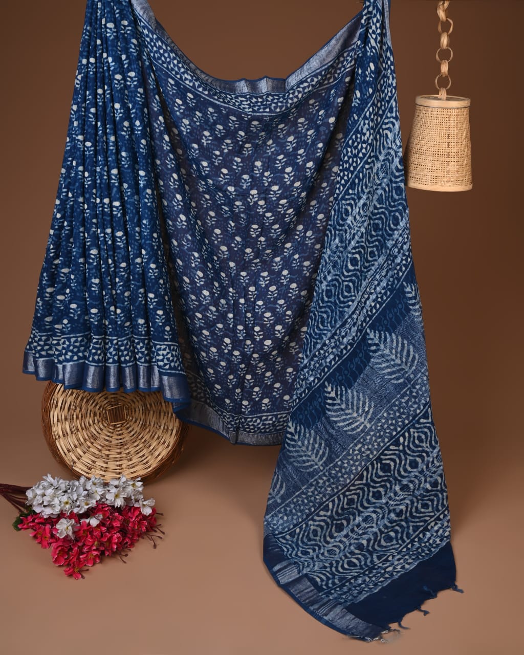 Wrap yourself in the captivating charm of our Indigo Floral & Geometric Print Linen Saree. The deep indigo backdrop serves as a canvas for intricate floral motifs and geometrical patterns, drawing inspiration from the timeless artistry of Indian crafts. Each design tells a story of heritage, delicately crafted to blend tradition with contemporary elegance.