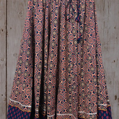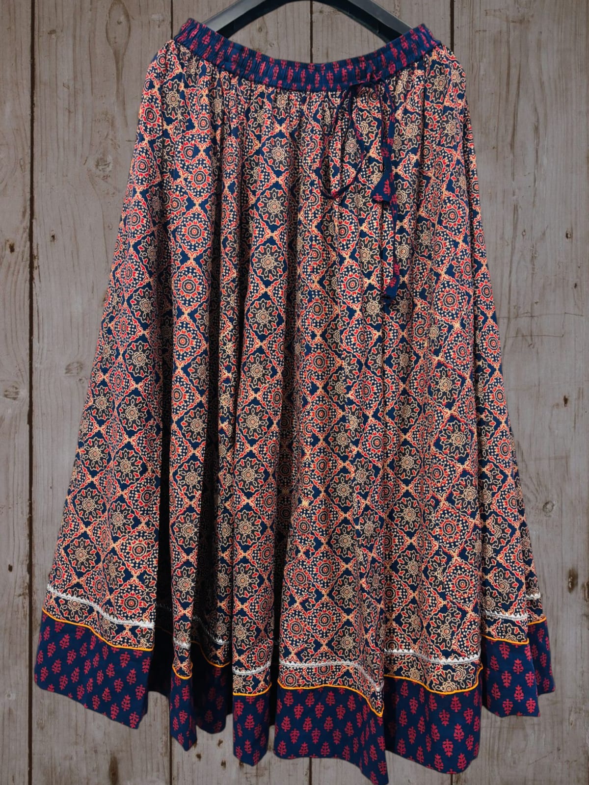 Elevate your style with our Indigo Floral Hand Block Cotton Skirt with Geometric Border. Crafted from pure cotton, this skirt features intricate hand block printing, an elastic waistband with a drawstring for a customizable fit, and a detailed all-over pattern. The contrasting border adds a touch of elegance, making it perfect for casual or semi-casual occasions. Embrace traditional Indian craftsmanship with this premium skirt.