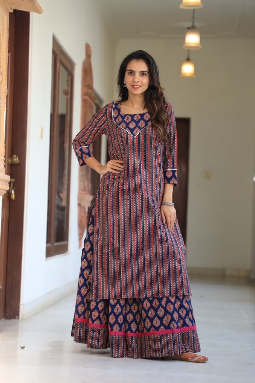 Elevate your ethnic wardrobe with this exquisite Indigo Floral Hand Block Printed Cotton Kurta Skirt Set. Crafted from premium cotton, this set features a beautifully designed kurta with a square neckline, contrasting yoke, and three-quarter sleeves. The skirt boasts a wide flare with a contrasting border, perfect for casual or festive occasions. Experience the comfort and craftsmanship of hand block printing in this artisanal ensemble.