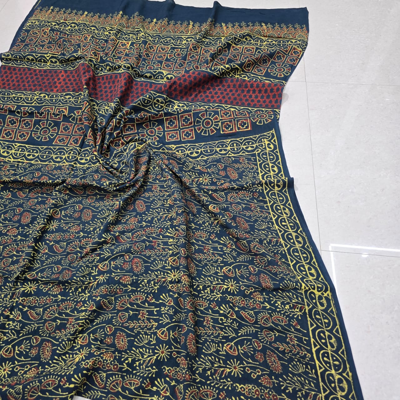 Elevate your ethnic wardrobe with this exquisite Indigo Floral Hand Block Printed Cotton Mulmul Saree. Crafted with care, this saree features intricate floral motifs in yellow and reddish-brown, showcasing traditional Indian craftsmanship. Made of lightweight and soft mulmul cotton, this saree offers both style and comfort. The set includes a matching printed blouse piece to complete your look.