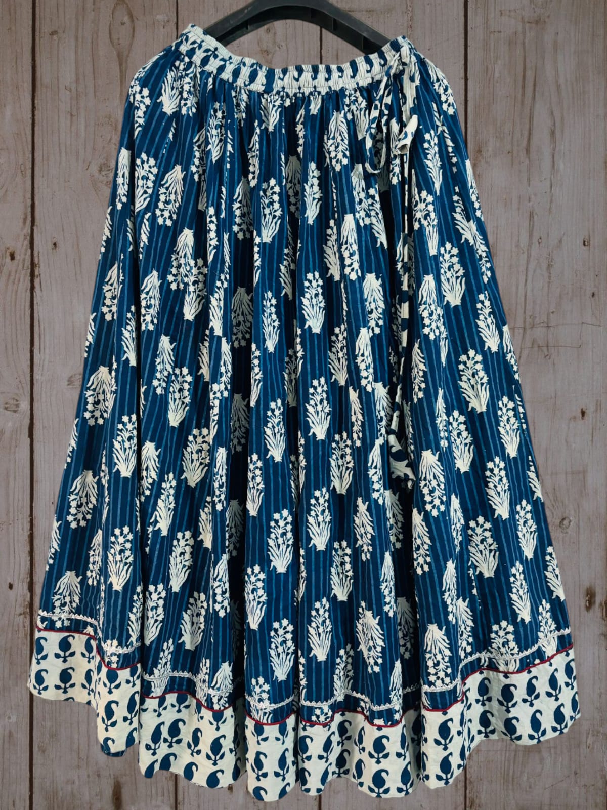 Indigo Floral Hand Block Printed Cotton Pleated Skirt