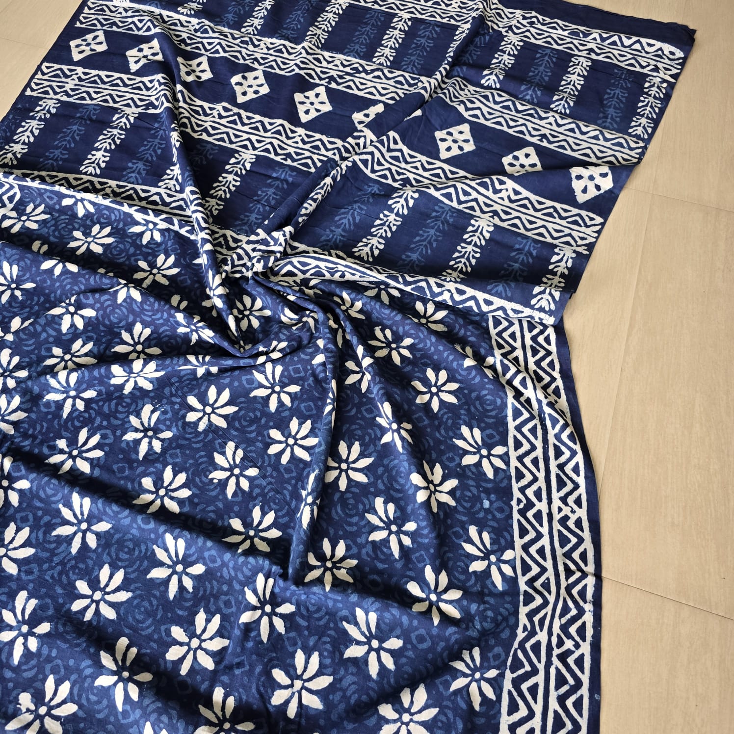 Indigo Floral Hand Block Printed Mulmul Cotton Saree