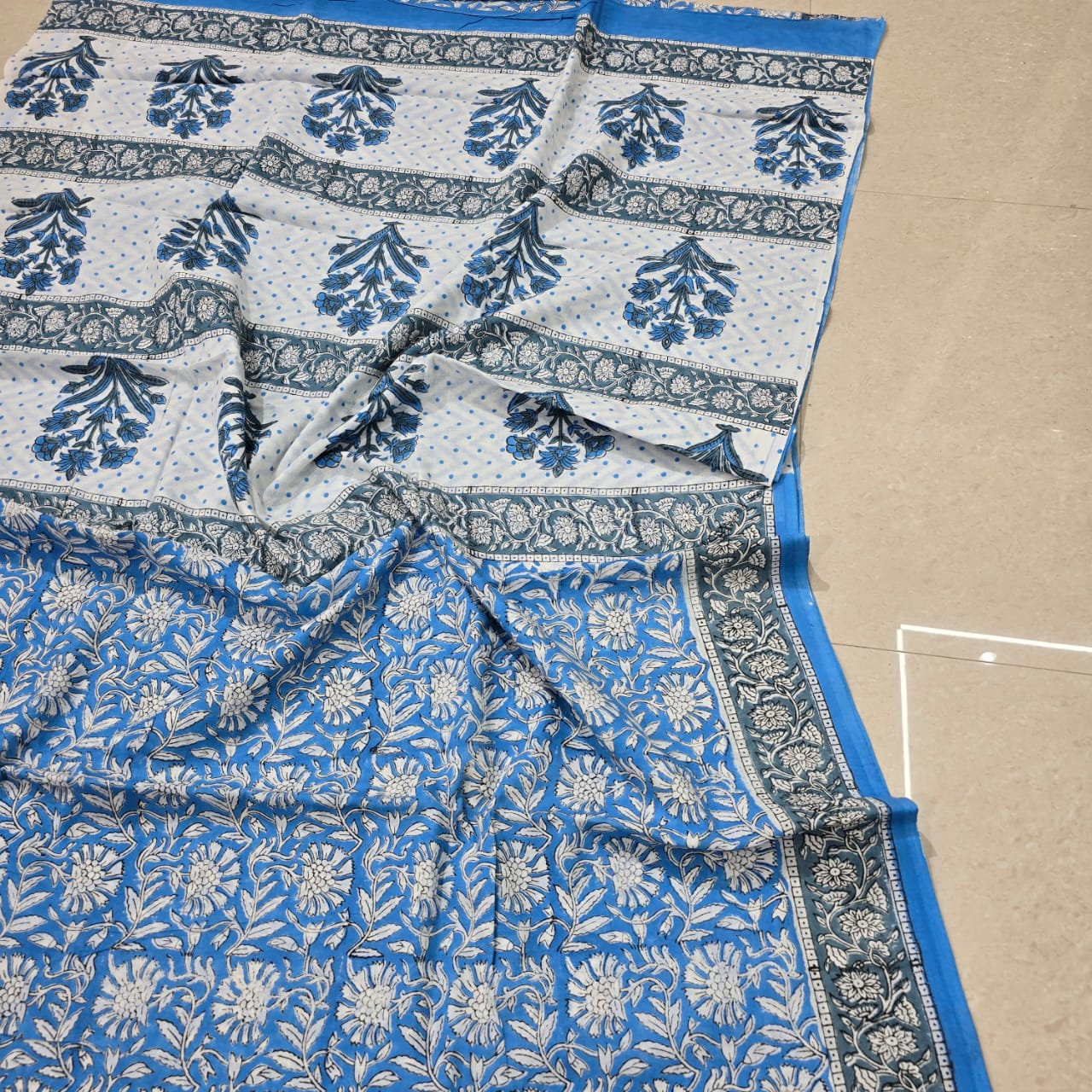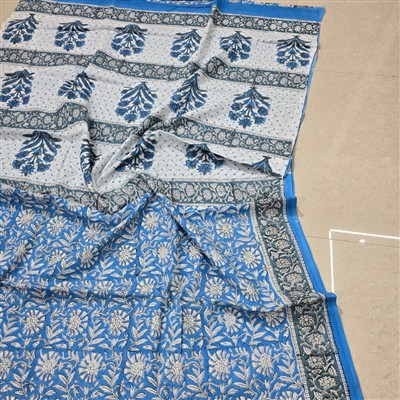 Indigo Floral Hand Block Printed Mulmul Saree Set