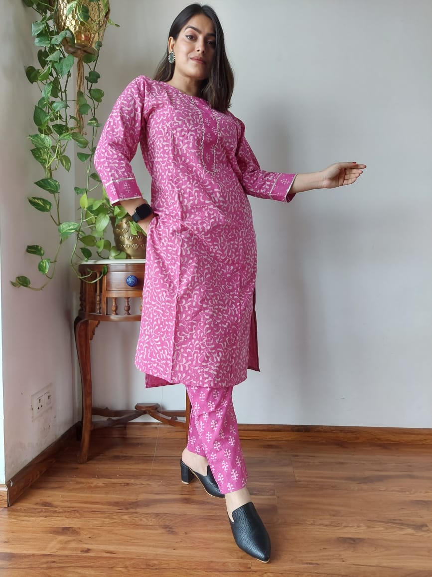 The intricate floral block prints, inspired by India’s rich textile heritage, create a captivating visual narrative that tells a story of artistry and culture. The elegant neck design and frock-style silhouette effortlessly combine comfort with a chic aesthetic, making it a versatile choice for a variety of occasions.