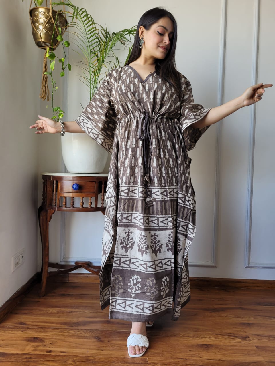 Indigo Geometric Block Print Cotton Kaftan Dress