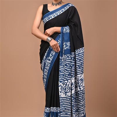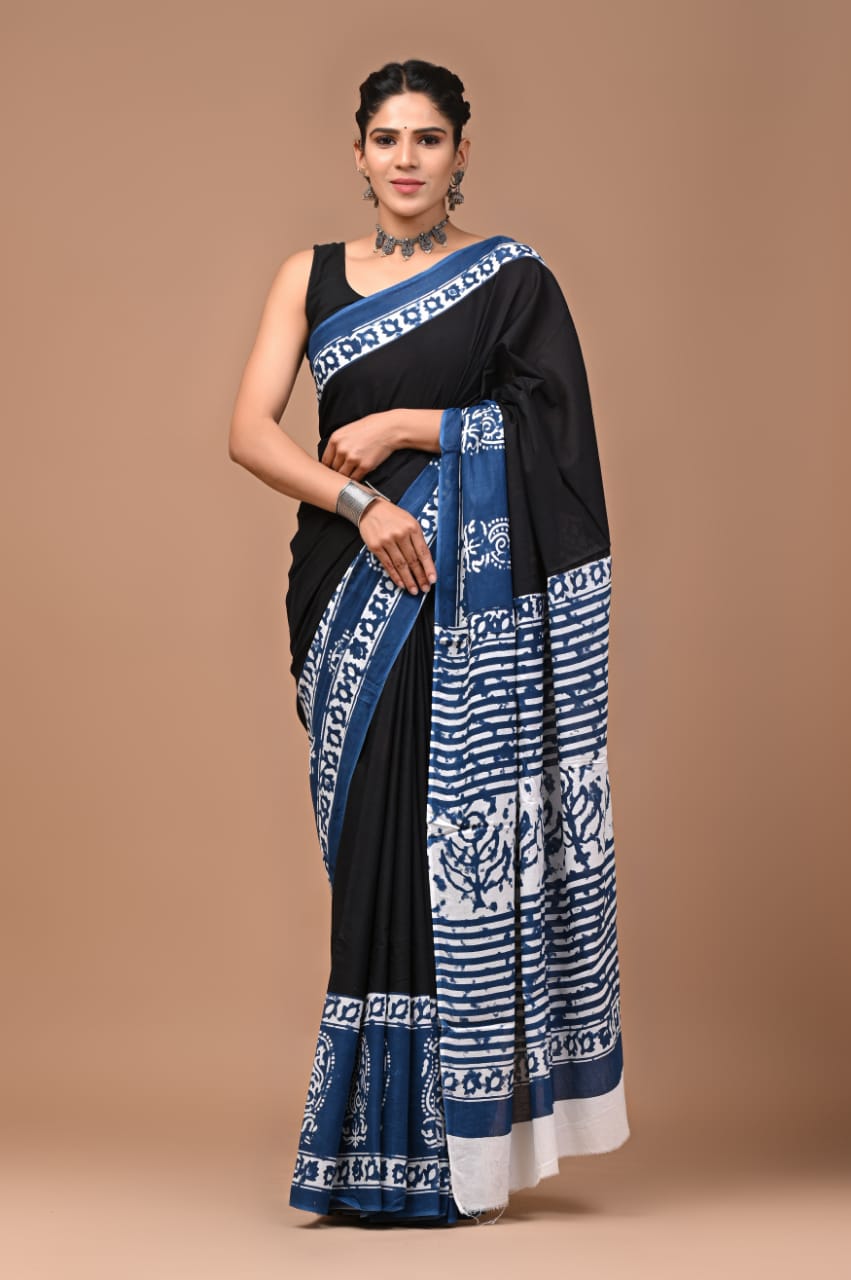 Indigo Geometric Hand Block Mulmul Cotton Saree with Blue Border