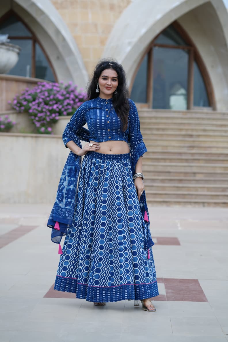 Indigo Geometric Hand Block Printed Cotton Crop Top Skirt Set with Mulmul Dupatta