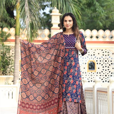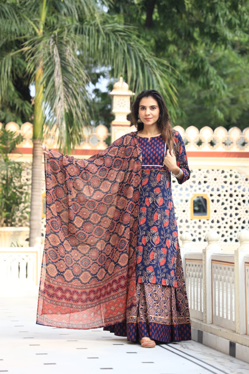 Immerse yourself in traditional Indian craftsmanship with this hand block printed ethnic dress set from Blockart. The kurta, featuring a mix of geometric patterns in indigo hues, is complemented by wide-leg palazzo pants and a sheer dupatta for a complete ensemble. Made from lightweight, flowy cotton fabric, this set offers both style and comfort, perfect for casual or semi-formal occasions. Each piece showcases intricate detailing and expert craftsmanship, reflecting the rich heritage of Indian textiles.