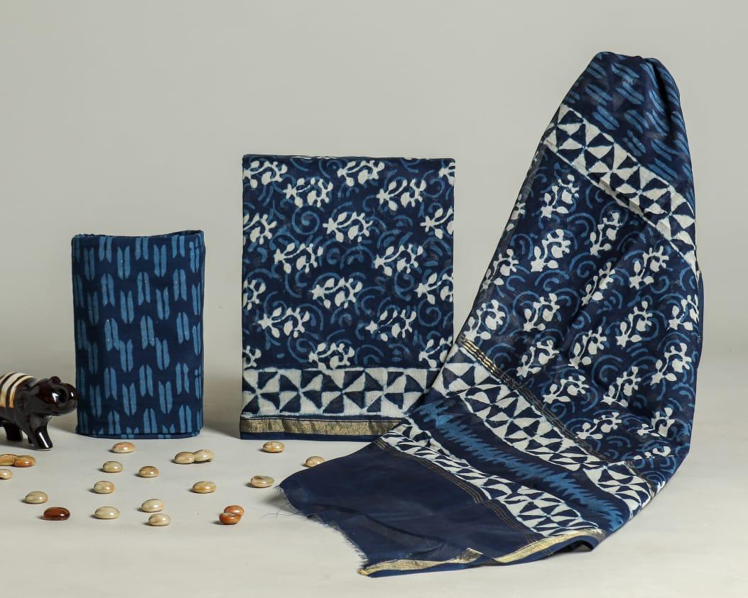 Embrace the elegance of Indian hand block printing with this ensemble, featuring a blend of sophistication and cultural richness. The soft texture and graceful drape of Chanderi silk offer both style and comfort. Make a statement with this artisanal creation that celebrates the heritage of Indian textiles.