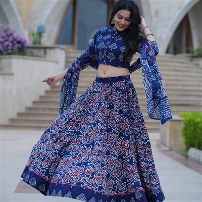 Indigo Hand Block Printed Cotton Lehenga Choli Set