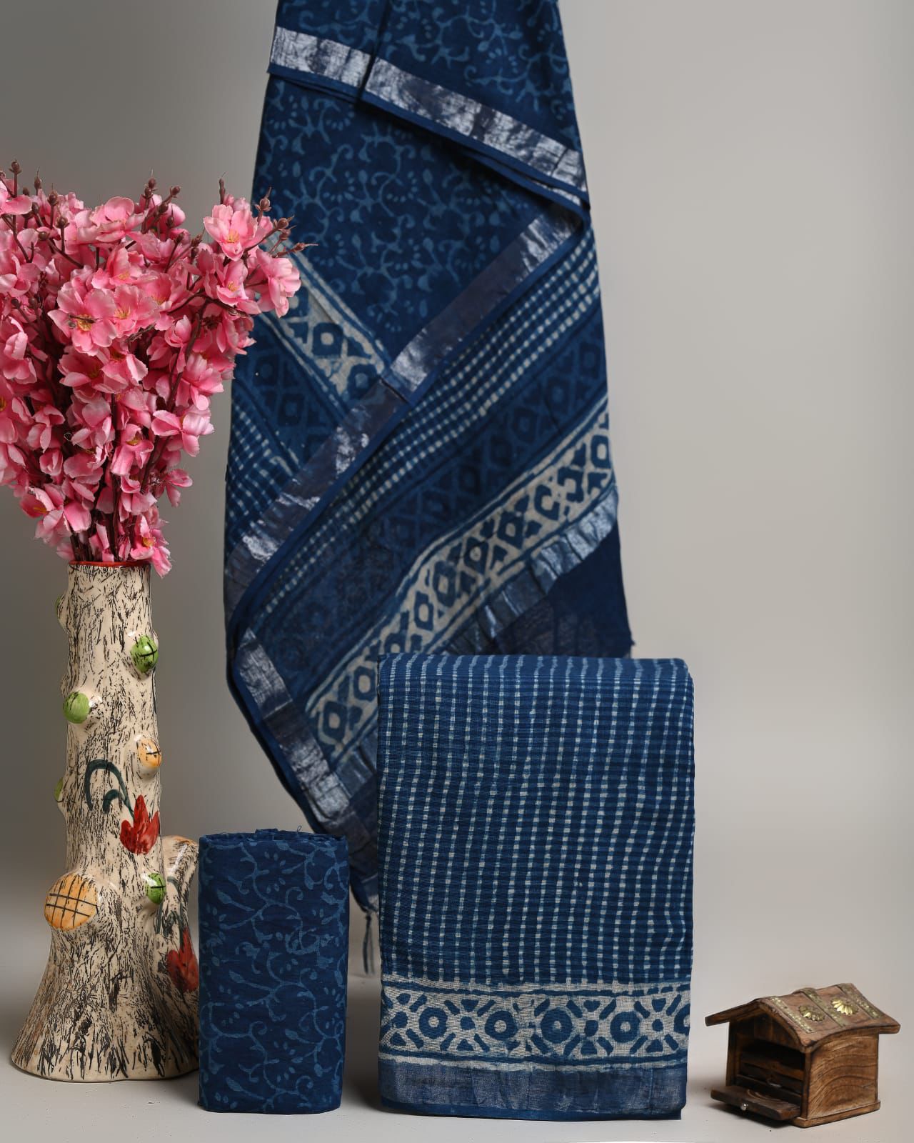 Indigo Hand Block Printed Linen Cotton Suit Set with Silver Border