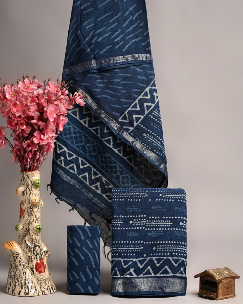 Elevate your ethnic wardrobe with this exquisite hand block printed linen cotton suit set from Blockart. Crafted with precision, this set features intricate geometric motifs on a rich indigo base, accentuated by silver borders for a touch of elegance. The linen cotton fabric offers a luxurious feel and excellent drape, ensuring both style and comfort. Embrace the timeless artistry of hand block printing with this premium ensemble.