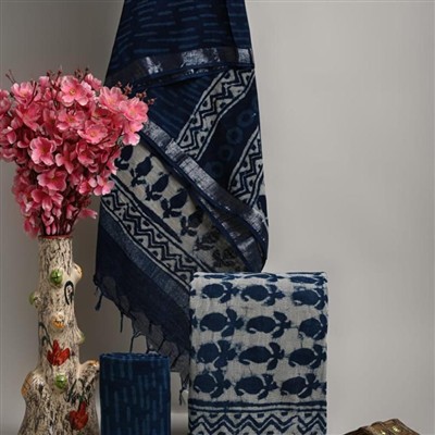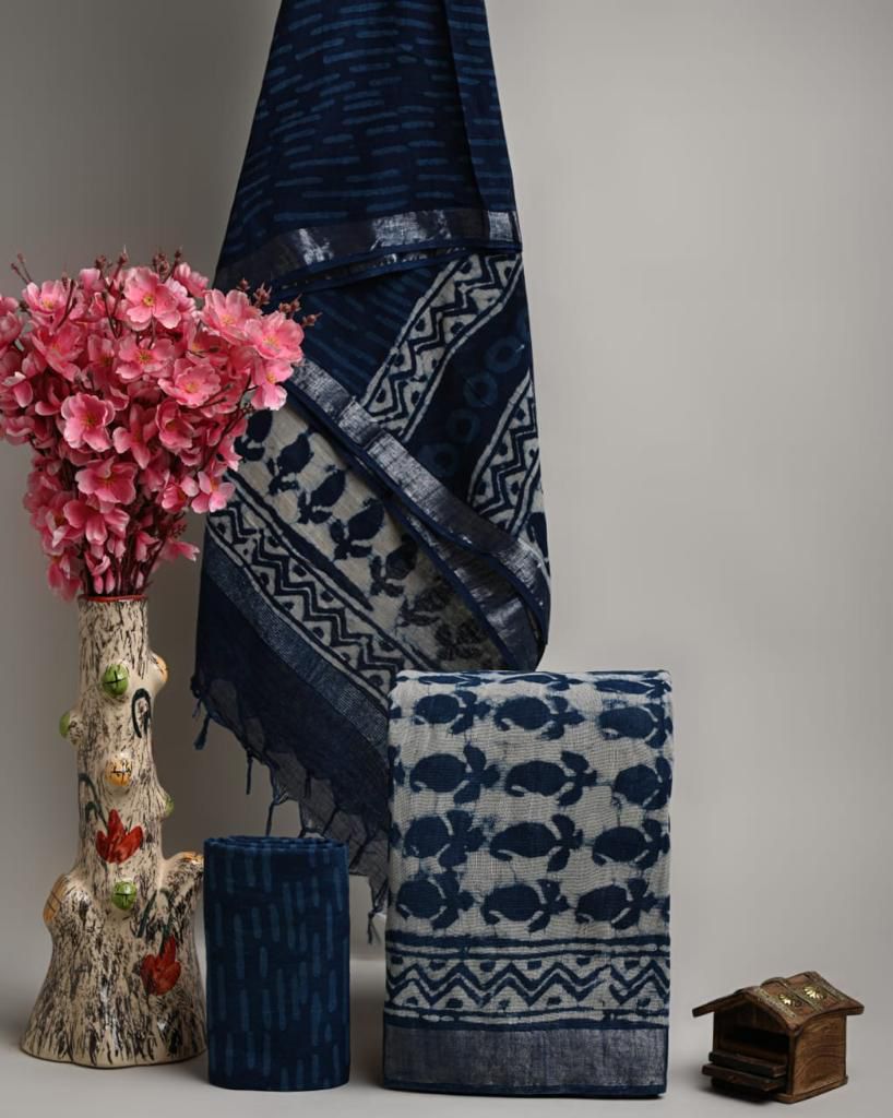 Indigo Hand Block Printed Linen Cotton Suits With Silver Border
