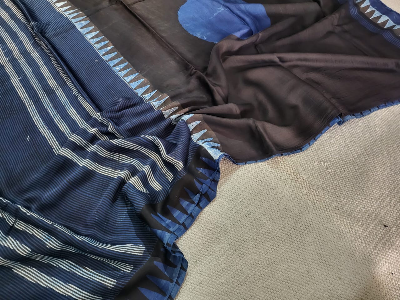 Embark on a journey of artistry with the Indigo Harmony Striped Modal Silk Saree. Inspired by traditional Indian textiles, this saree showcases a harmonious blend of dark brown, blue, and white hues. Crafted using intricate handblock printing techniques, the saree features elegant blue triangular accents along the border, adding a touch of sophistication to its design.