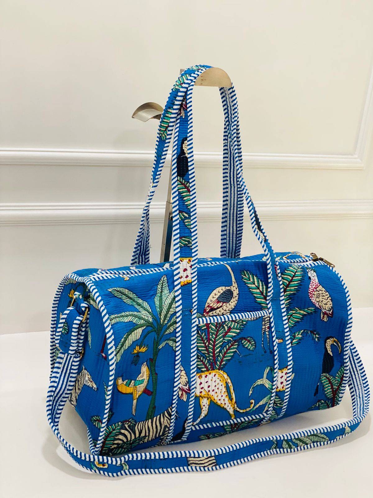 Embark on an Indigo Jungle Adventure with this unique quilted duffle bag by Blockart. The vibrant blue color and multicolored jungle print featuring various animals and foliage make it a playful companion for your travels. The hand block prints showcase the traditional artisan techniques, adding a touch of heritage to your style. Not just visually appealing, this bag offers practical benefits with its spacious size and secure zippered closure. Feel the emotional connection to the craft every time you carry this duffle bag, carefully made for lasting wear.