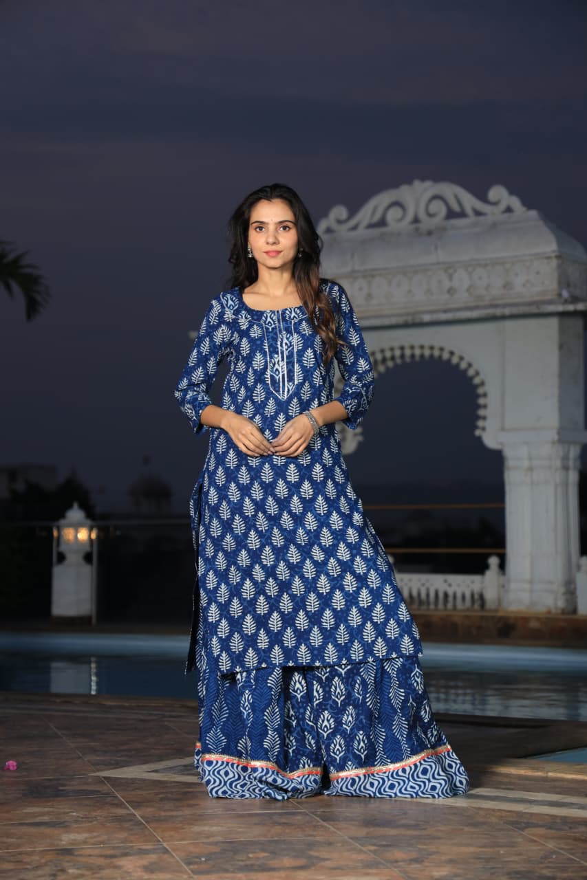 Indigo Leaf Hand Block Printed Cotton Ethnic Kurta and Palazzo Set