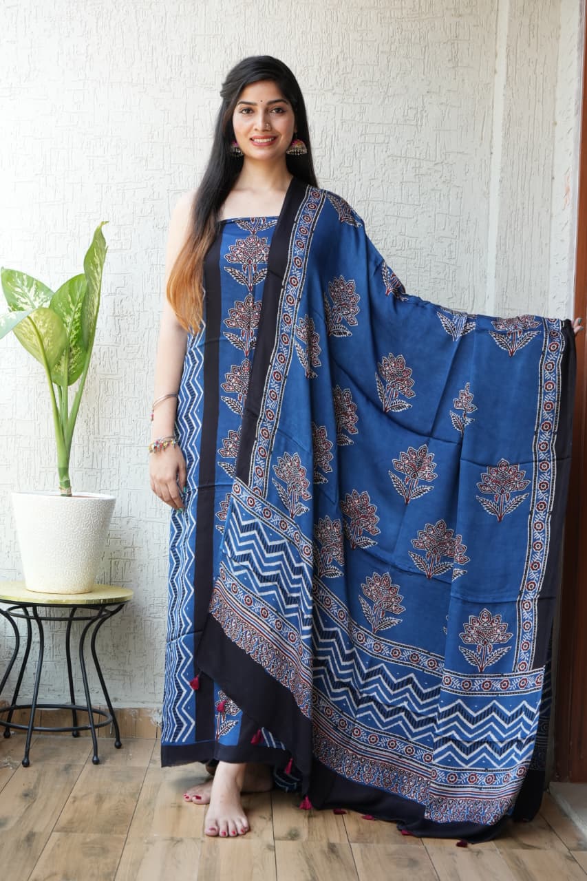 Embark on a journey of elegance with the Indigo Serenity Modal Suit Set. Inspired by traditional Indian artistry, this ensemble features intricate floral and geometric patterns meticulously handcrafted on a soft cotton blend fabric. The deep blue hue complemented by white, red, and brown accents evokes a sense of serenity and sophistication.