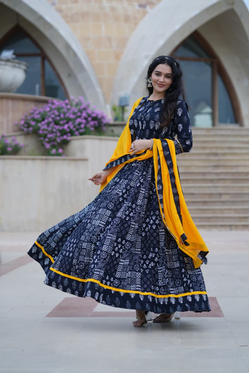 Elevate your ethnic wardrobe with this exquisite handcrafted ensemble from Blockart. This Anarkali dress features intricate white motifs on a rich indigo cotton fabric, exuding elegance and charm. The dress is designed with a round neckline, long sleeves, and a yellow border at the hem, complemented by a matching Mulmul Dupatta with navy blue borders. Hand block printed by skilled artisans, this outfit offers a comfortable fit and a touch of traditional craftsmanship.