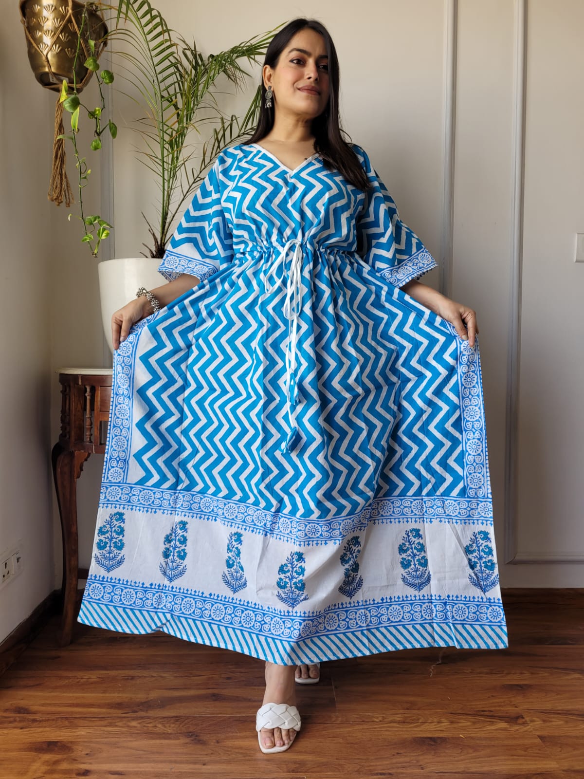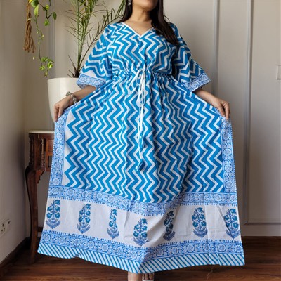 Experience the artistry of hand block printing with our Indigo Zigzag Stripe Cotton Maxi Dress. Crafted from 100% pure cotton, this free-size kaftan features a V-neckline, drawstring waist, and elbow-length sleeves. The upper and middle sections showcase blue and white zigzag stripes, while the lower part boasts intricate floral motifs on a white background. Elevate your style with this comfortable and breathable piece, perfect for warm weather.