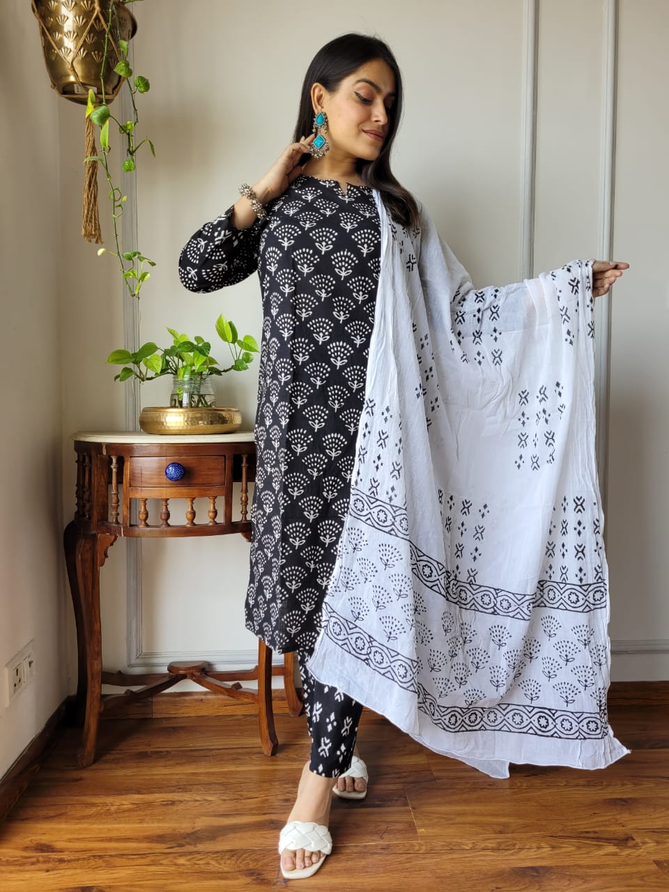 Discover the elegance of the Ivory Black Floral Essence Cotton Suit, where tradition intertwines with contemporary flair. Each piece is an artisan-crafted delight, showcasing intricate hand block prints that narrate the story of skilled craftsmanship. The kurti features a graceful round neckline and three-quarter sleeves, adorned with a symphony of floral motifs that breathe life into the rich black fabric.