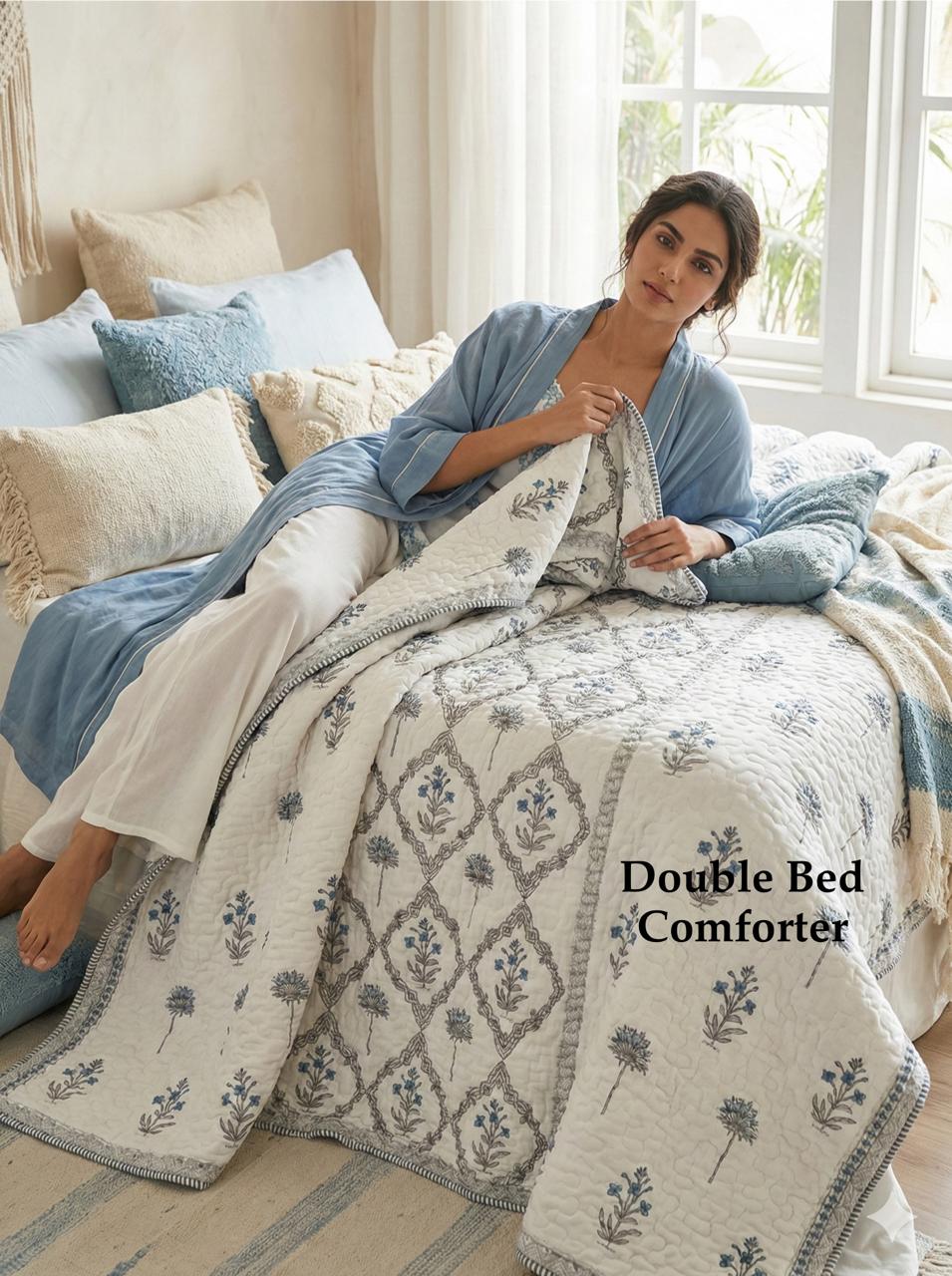 In the heart of every home lies a sanctuary—a space where creativity intertwines with comfort. The Ivory Blossom Diamond Quilted Cotton Comforter captures this essence, showcasing an exquisite balance of contemporary design and time-honored craftsmanship. Adorned with delicate floral motifs in muted blue and soft gray against a gentle ivory backdrop, this comforter is not just bedding; it’s a piece of art.