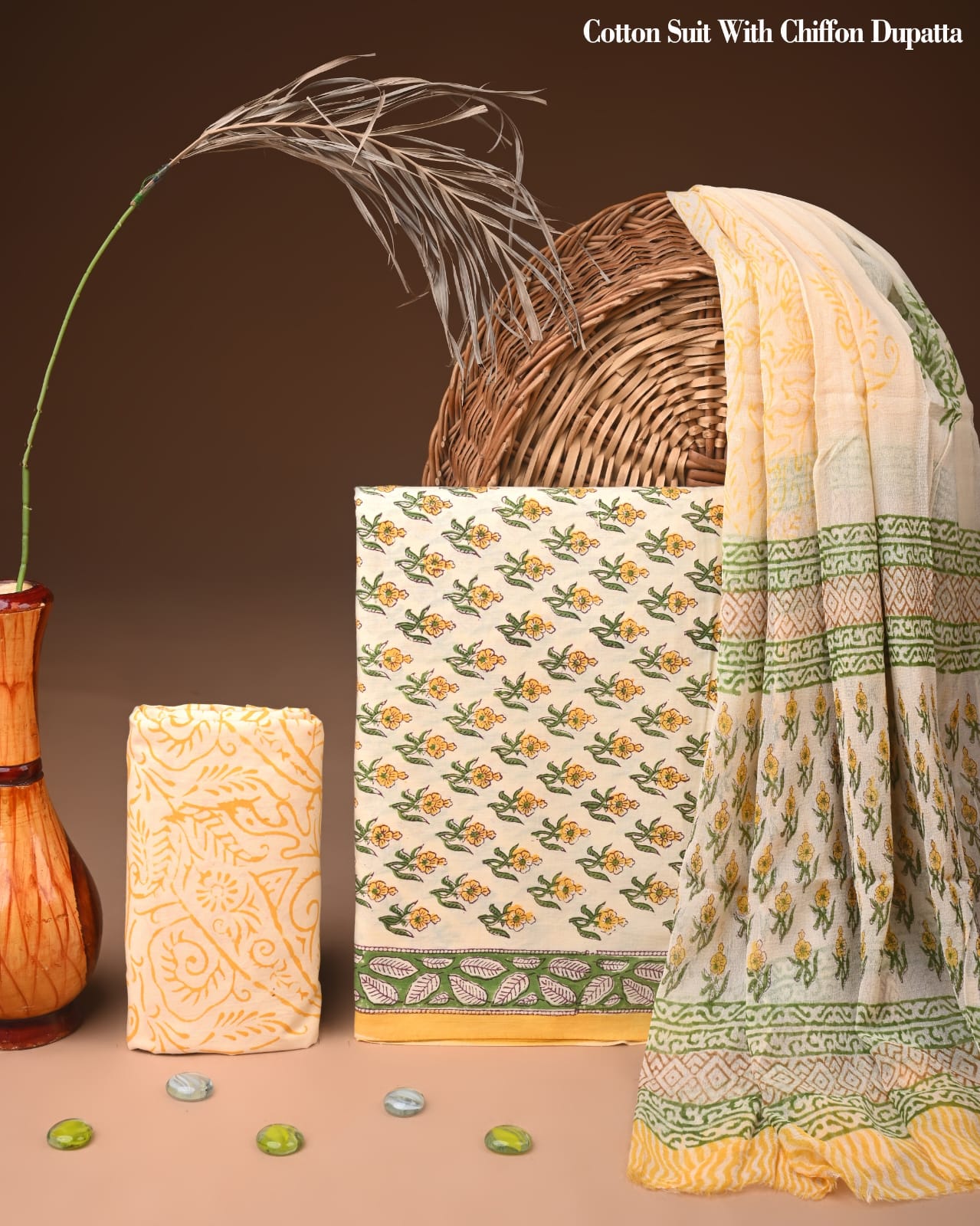 Rooted in the rich traditions of Indian textile artistry, this exquisite suit set showcases a creamy beige canvas adorned with vibrant mustard yellow and soft olive green floral motifs. The intricate hand block printing technique brings each design to life, encapsulating the essence of skilled craftsmanship. Perfectly balanced with geometric borders in emerald green and lavender, this ensemble invites you to refresh your wardrobe with a touch of elegance.