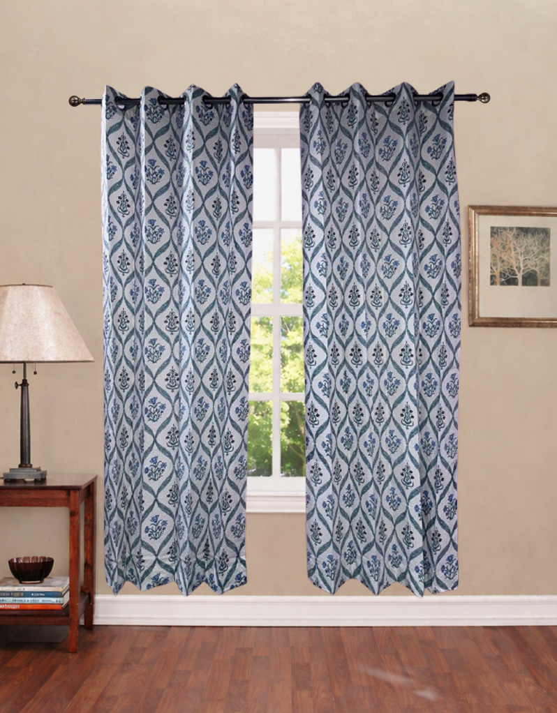 Immerse your home in a tapestry of tradition and artistry with these Ivory Floral Harmony Cotton Curtains. The serene ivory backdrop beautifully showcases intricate floral patterns in shades of sky and navy blue, each crafted with meticulous care to reflect the essence of Indian craftsmanship.