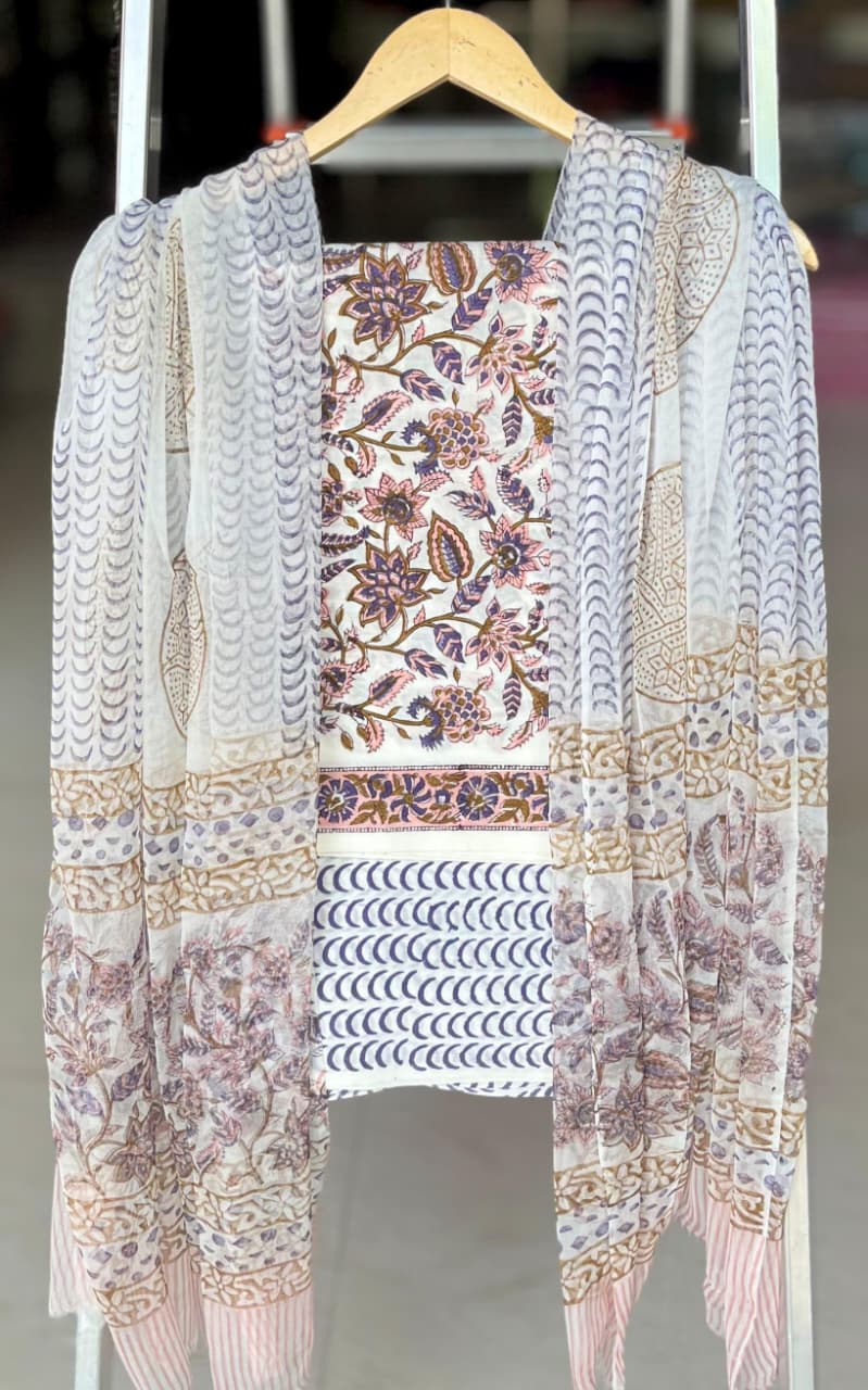 Meticulously crafted from 100% pure cotton, this unstitched three-piece set includes a comfortable top, coordinating bottom, and a flowing chiffon dupatta. Each piece reflects the meticulous hand block printing technique, ensuring that no two garments are alike—a true testament to the skilled artisans behind this creation.