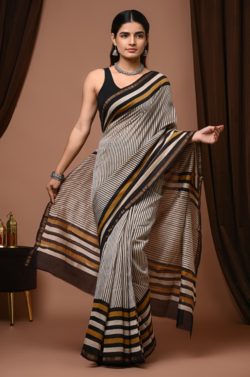Are you in search of a piece that beautifully merges tradition with a contemporary twist? This ivory beauty features bold geometric patterns that dance across a lustrous Chanderi silk backdrop, intricately hand-block printed using organic dyes. The harmonious blend of deep black and warm mustard yellow stripes creates a striking visual rhythm that’s sure to capture attention.