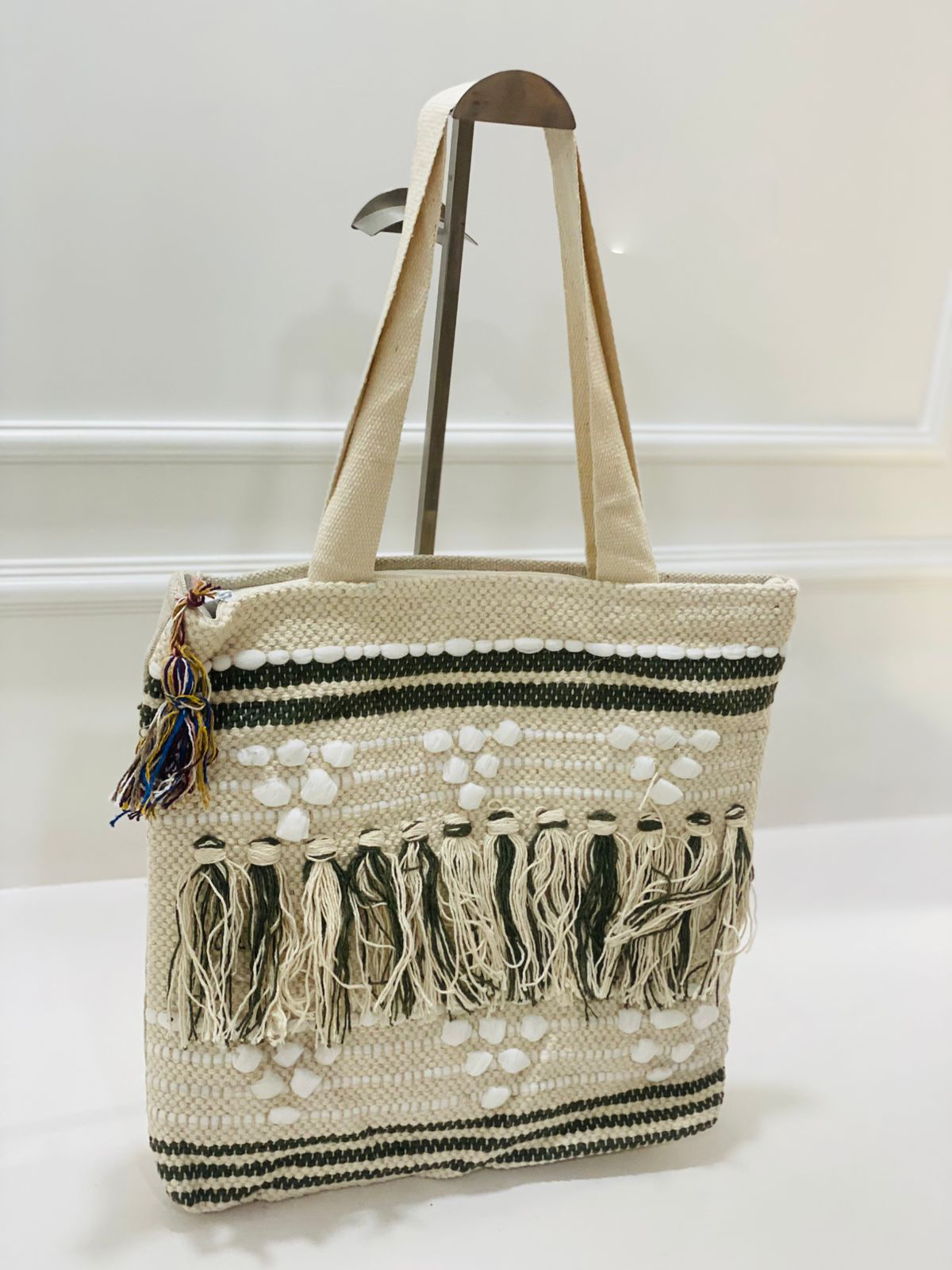 Are you searching for a bag that seamlessly blends tradition with a contemporary twist? Look no further! The Ivory Geometric Weave Cotton Jhola Bag offers a delightful mix of earthy tones and playful patterns. The soft ivory base is beautifully accented by dark green stripes, creating a striking visual that’s both calm and invigorating.