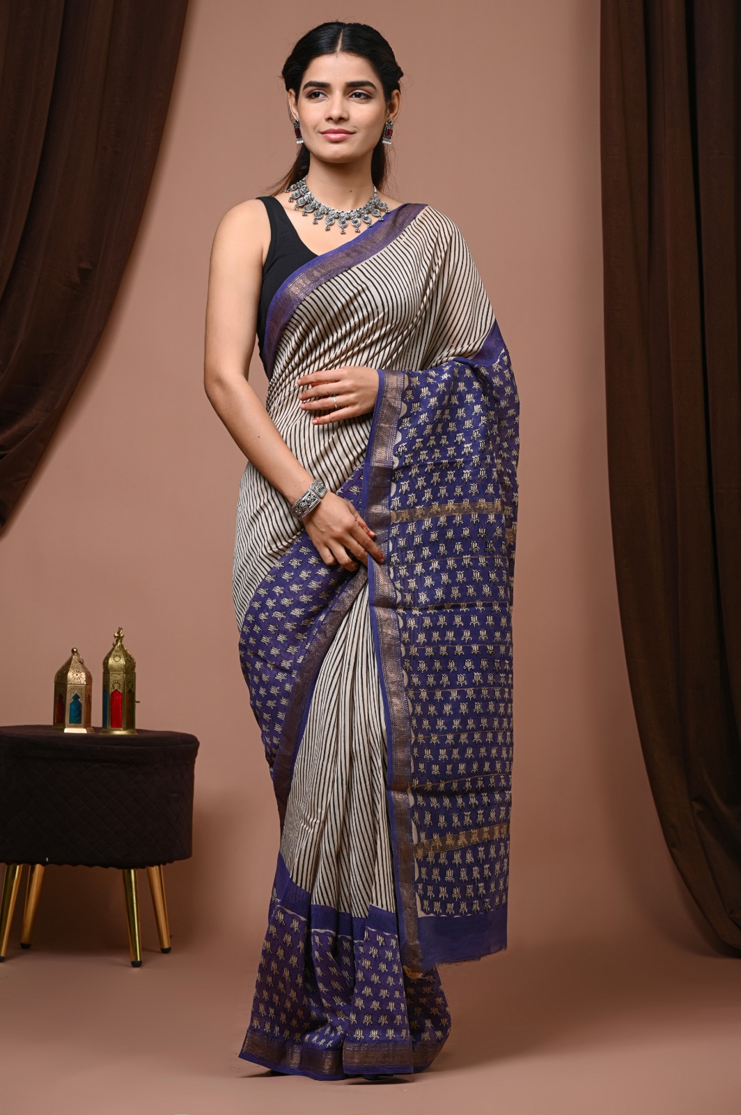 The beautiful interplay of ivory and deep navy blue evokes a sense of serenity, while the delicate floral motifs add a touch of whimsy. Each detail, from the carefully placed patterns to the metallic gold trim, reflects the artistry of skilled artisans dedicated to preserving Rajasthani heritage.