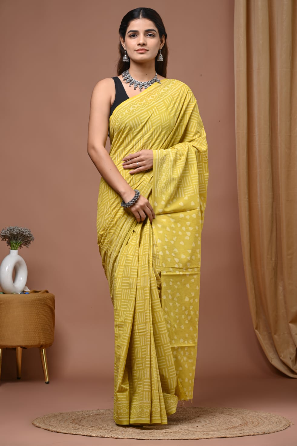 Jaipuri Mustard Geometric Mulmul Cotton Saree 5.5 meters