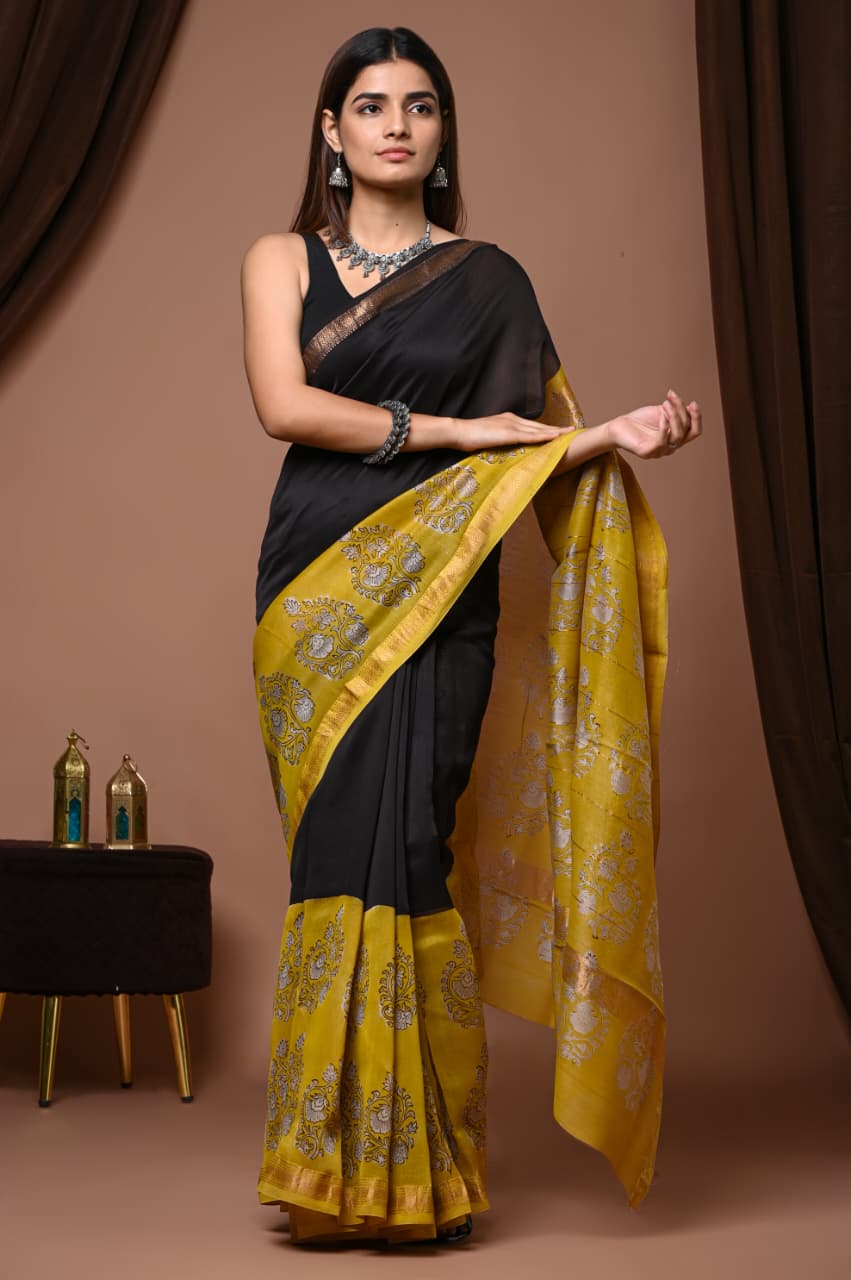 Imagine a celebration where every thread tells a story. Our Jet Black Floral Border Maheshwari Silk Saree effortlessly combines the rich heritage of Rajasthani craft with modern elegance. The deep jet black fabric flows gracefully, while the vibrant mustard border adorned with intricate floral motifs adds a striking contrast that captivates the eye.