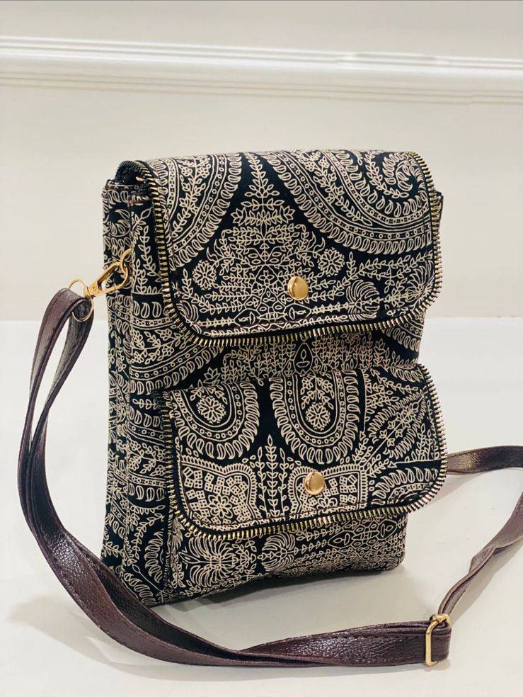 This sling bag not only showcases the beauty of handcrafted textiles but also offers practical features for everyday use. The structured body maintains its elegant shape, while the artistic patterns evoke a sense of sophistication and charm.