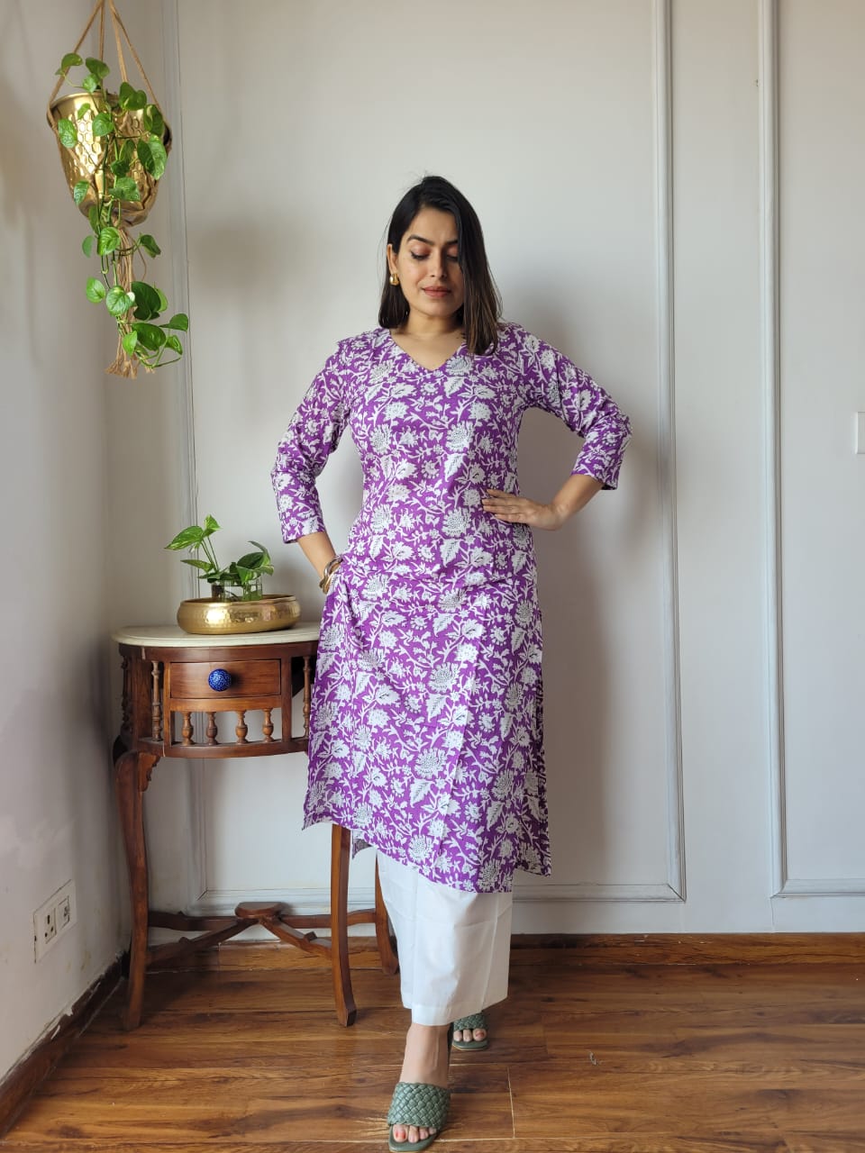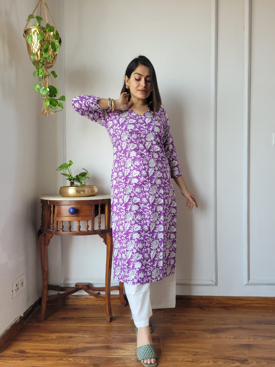 Lavender Blooms Hand Block Printed Cotton Kurta Set with White Pants