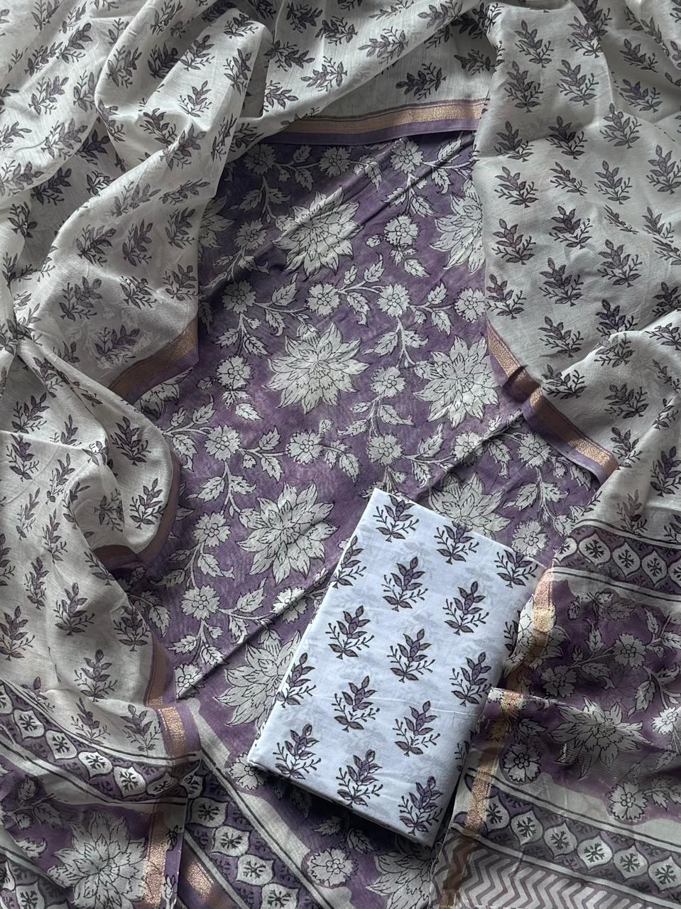 This hand block printed chanderi silk dress materials with chanderi silk duptta set includes: