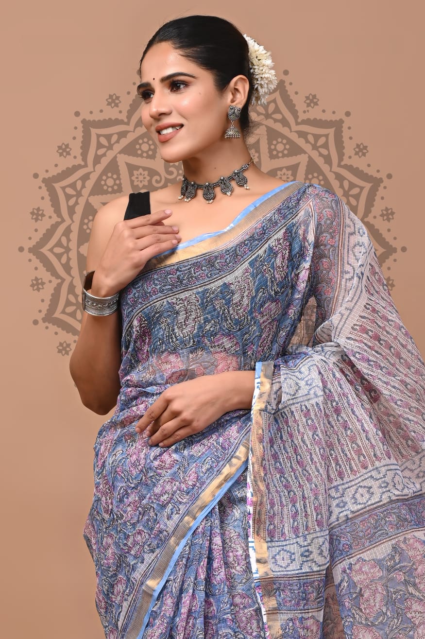 In a gentle embrace of delicate lavender hues, this Kota Doria saree is a canvas of artistry, where vibrant floral motifs playfully dance across its soft surface. The intricate hand block prints whisper tales of tradition, inviting you to refresh your wardrobe with a piece that beautifully showcases the essence of Indian craftsmanship.