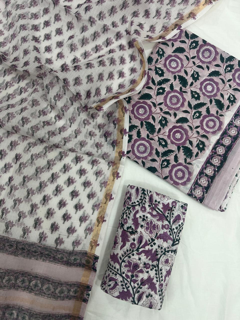 Woven into the fabric of our culture, this Lavender Blossom Geometric Cotton Dress Material is a tribute to the intricate artistry of Indian craftsmanship. The fabric showcases a harmonious blend of floral elements and geometric shapes, creating an enchanting visual symphony. The delicate lavender and deep plum hues, paired with emerald accents, tell a story of nature’s beauty, while the soft white background brings a fresh perspective.