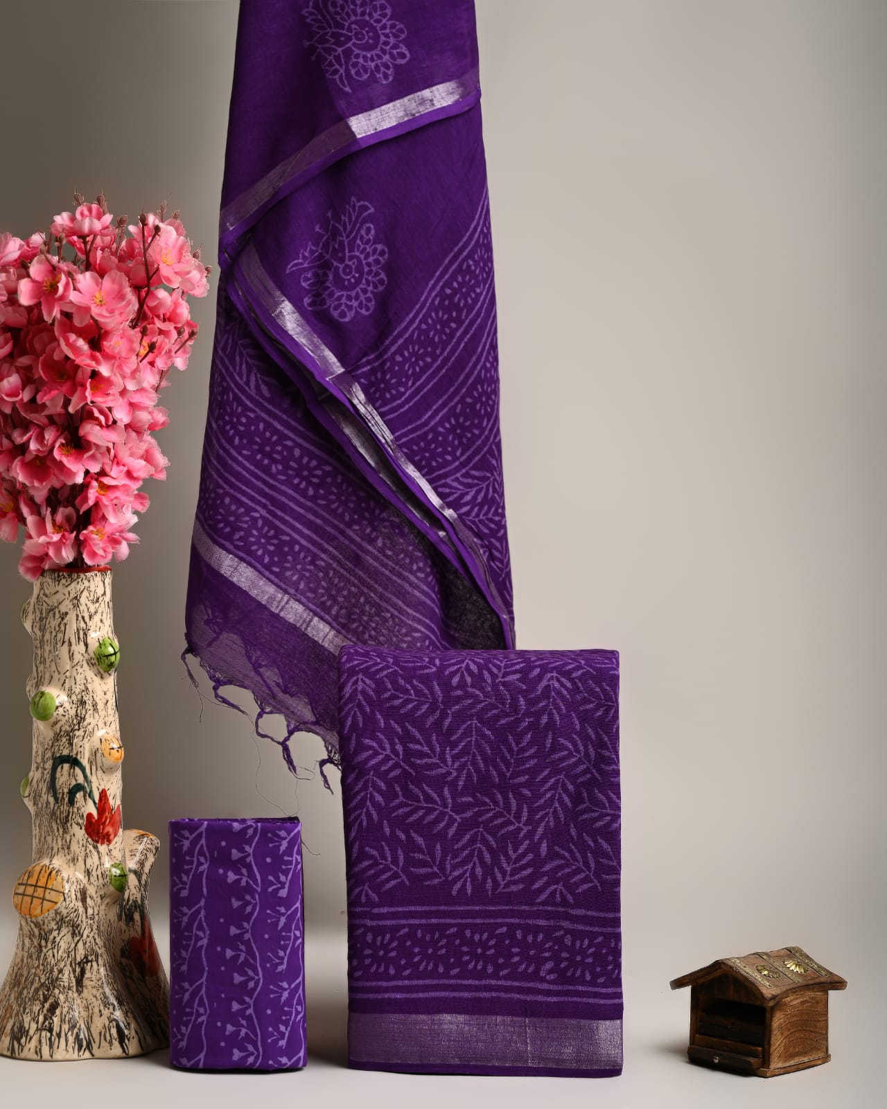 Lavender Blossom Hand Block Linen Suits with Silver Border