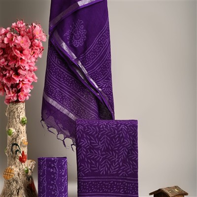 Indulge in the artistry of Bagru Hand Block Printing with this exquisite set. Crafted from premium Linen Cotton fabric, this set features intricate floral and leaf patterns in a soothing lavender hue. The silver border adds a touch of elegance, making it a perfect choice for those who appreciate traditional craftsmanship. The lightweight and sheer texture ensure comfort while exuding a sense of ethnic charm.
